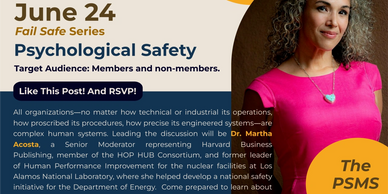 It's an honor to connect with pipeline safety professionals on the important topic of psychological safety and it's contribution to safety capacity. This virtual event is open to members and non-members of the PSMS. I'll be speaking on June 24, 2022 at noon EDT.